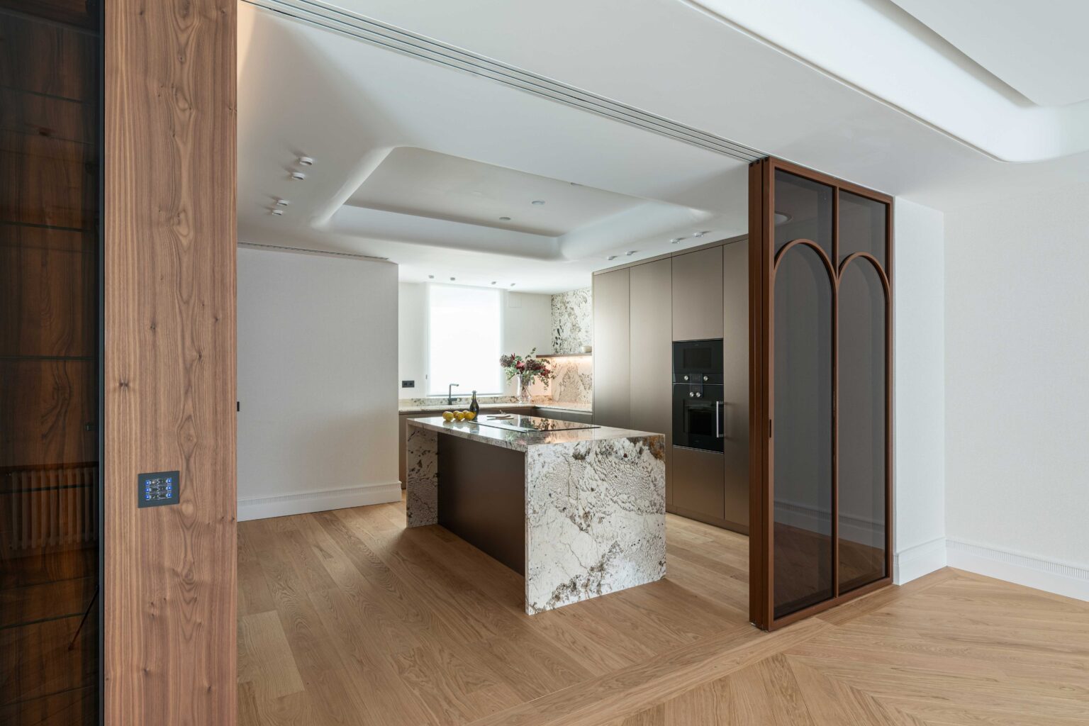 El uso de materiales nobles —como piedra natural, madera o acabados metálicos— convierte cada isla en una pieza escultórica. La iluminación integrada, las formas curvas o los frentes
