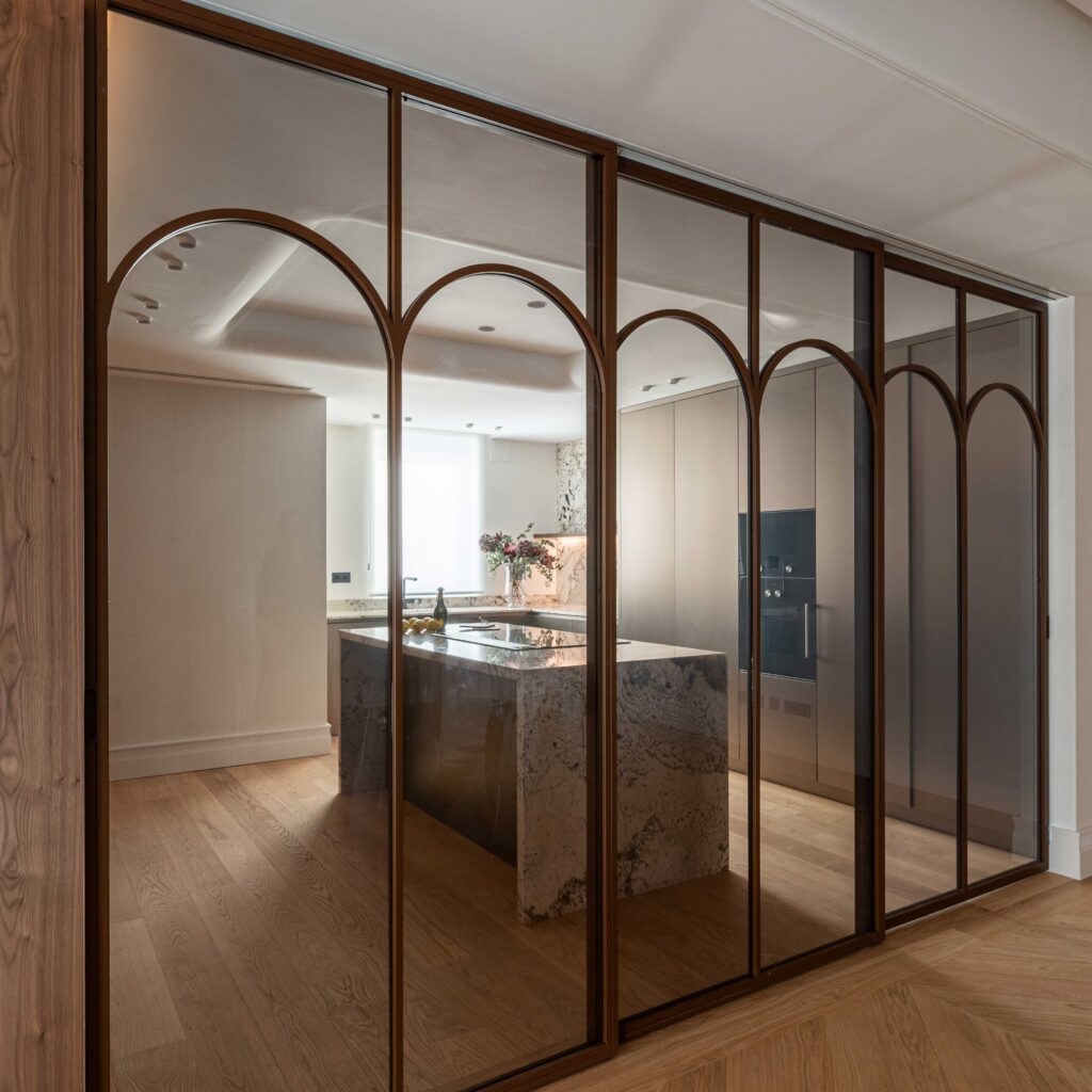 En cocinas abiertas al salón o al comedor, se impone una división sutil: cerramientos acristalados con perfilería fina, estanterías abiertas, celosías de madera o paneles correderos.