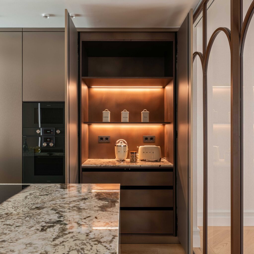 Campanas ocultas, electrodomésticos panelados y soluciones de almacenaje a medida permiten que todo quede integrado en un mismo lenguaje visual. La tecnología está, pero no